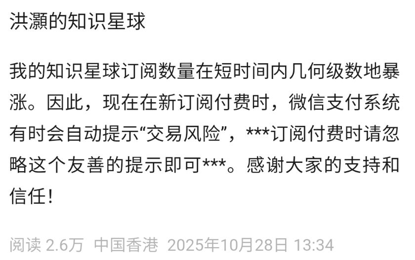 截图自:洪灏个人微信公众号 由于订阅用户短期内增长较快,甚至导致微信支付系统有时会自动提示“交易风险”,日前他还在个人微信公众号上就相关的付费问题发布了一则声明。 公开信息显示,目前洪灏的知识付费布局采用 “公众号+知识星球”双轨模式:公众号主打深度分析文章,需单独付费阅读(据记者观察,目前洪灏个人微信公众号上的大部分文章都需要付费才能阅读全文);知识星球则聚焦实时观察,形成独立付费体系。