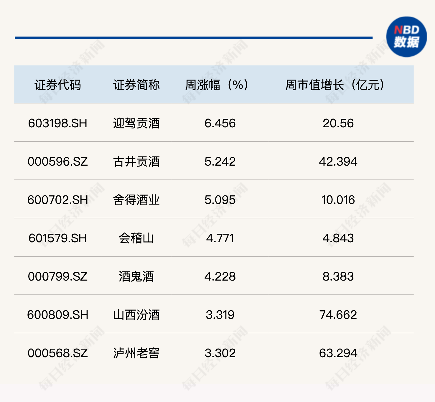 每经记者|刘明涛 每经编辑|肖芮冬 本周,白酒行业三季报披露完毕。与市场预期一致,白酒企业2025年三季度报表普遍加速出清、风险持续释放。利空暂时出尽后,Wind白酒指数实现反弹,本周涨幅达到1.32%,以60126.53点报收。 有券商机构指出,白酒板块估值、市场预期、机构持仓已处在历史低位。同时,“茅五泸洋”等龙头酒企已在分红上树立标杆,优质龙头估值低位叠加股息率支撑,白酒板块绝对收益布局正当时。 白酒板块“低调”反弹在消费弱复苏背景下,白酒三季度业绩延续承压,不少酒企出清幅度超市场预期,行业已处于明确“去库存”阶段。不过,随着业绩和估值进入“双底”区间,Wind白酒指数本周实现稳步反弹,该指数周涨1.32%,跑赢沪深两指,板块内多只个股实现上涨。 具体来看,迎驾贡酒和古井贡酒反弹幅度较大,本周涨幅分别达到6.46%和5.24%;舍得酒业和酒鬼酒周涨幅也在5%左右。周市值增长方面,山西汾酒和泸州老窖周市值增长分别为74.66亿元和63.29亿元,市值增长相对较大。