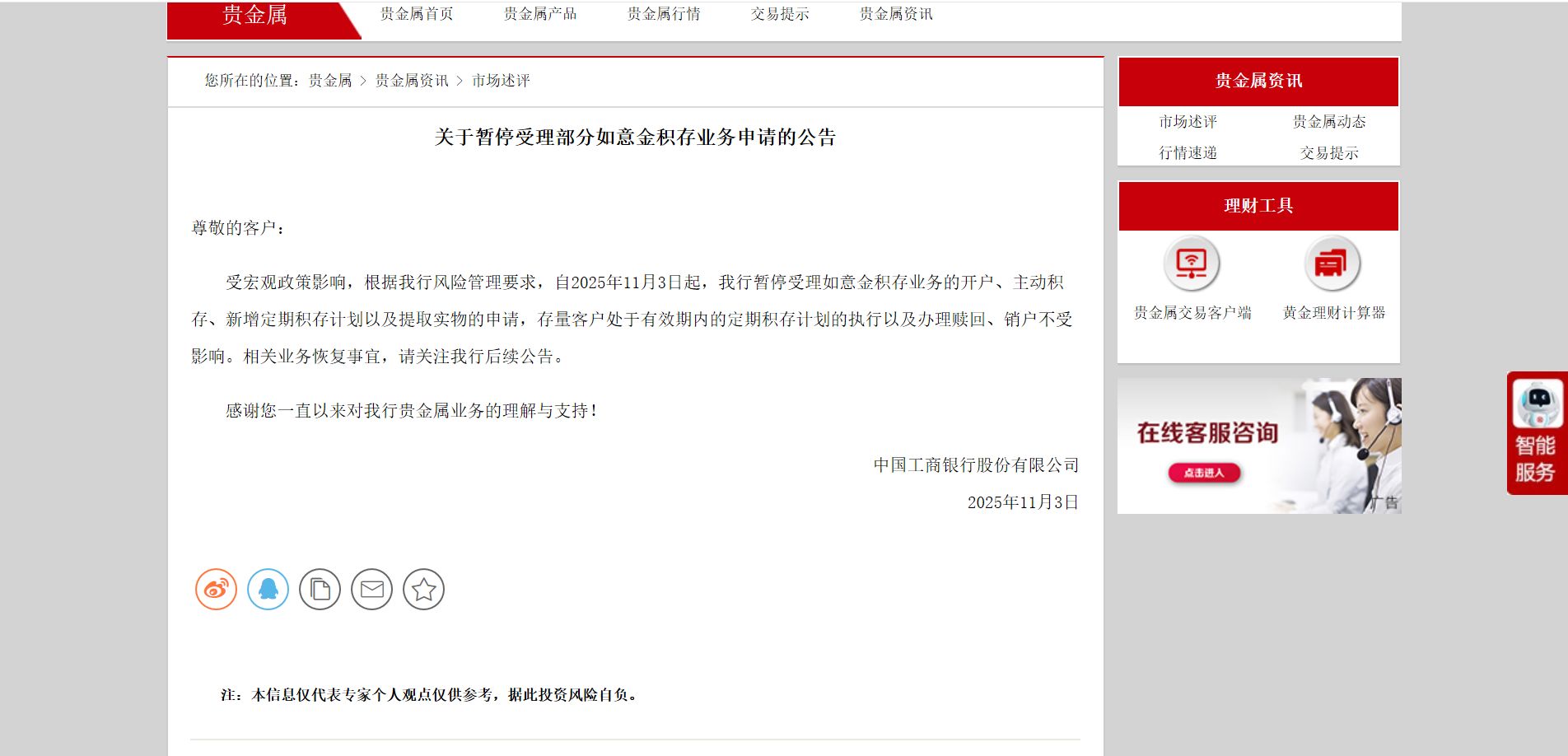 每经编辑|毕陆名 11月3日,工商银行今日发布公告,受宏观政策影响,根据我行风险管理要求,自2025年11月3日起,我行暂停受理如意金积存业务的开户、主动积存、新增定期积存计划以及提取实物的申请,存量客户处于有效期内的定期积存计划的执行以及办理赎回、销户不受影响。相关业务恢复事宜,请关注我行后续公告。