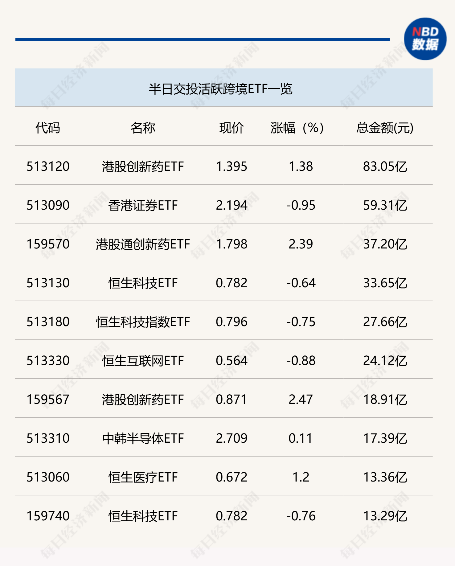 每经记者|刘明涛 每经编辑|叶峰 今日上午,港股创新药ETF(513120)持续放量,半日成交金额高达83.05亿元,而港股通创新药ETF(159570)半日成交金额也达到37.2亿元,相较跨境类创新药ETF的成交放量,香港证券ETF(513090)略有缩量,半日成交金额为59.31亿元。在行业、主题ETF方面,煤炭、有色等行业ETF交投活跃,半日成交金额在10亿元左右。