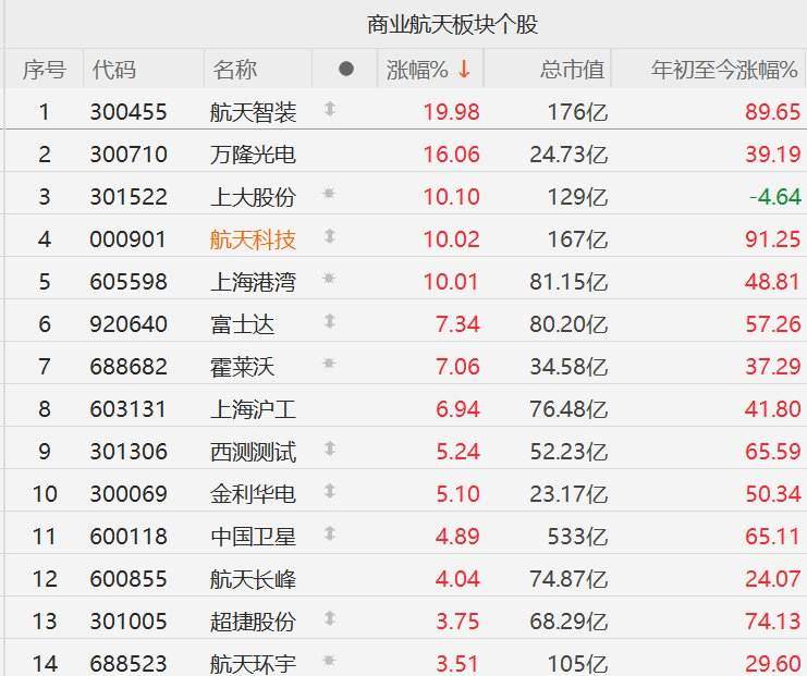 格隆汇11月3日|A股市场商业航天股集体走强,其中,航天智装20CM涨停,万隆光电(300710)涨16%,上大股份涨超10%,航天科技、上海港湾10CM涨停,富士达、霍莱沃涨超7%,上海沪工(603131)涨超6%,西测测试、金利华电(300069)涨超5%。