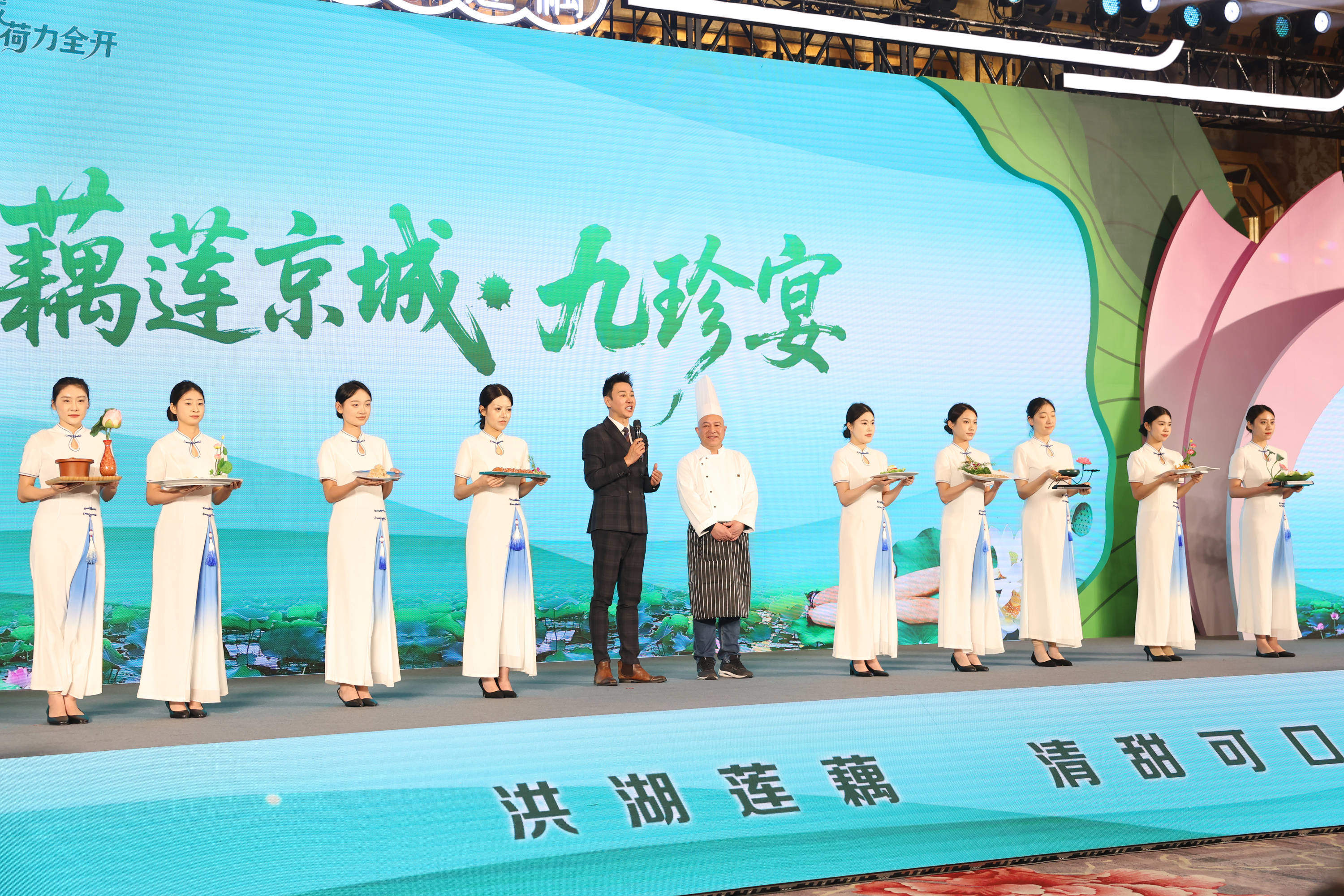 在“藕莲京城?九珍宴”互动环节,洪湖藕汤、香煎藕夹、御膳藕丸、桂花蜜藕、清炒藕带、炕蒸藕饼、冰心玉莲、芝麻藕条、荷塘三宝,九道美食依次登场,让大家品尝到“舌尖上的洪湖”,每一份美食,都凝聚着洪湖莲藕的独特魅力。九道菜,既有家常的温暖,又有创意的巧思,每一道都是洪湖莲藕与楚菜匠心的完美碰撞。
