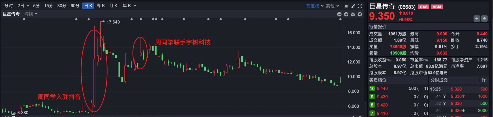 每经记者|曾子建 每经编辑|袁东 今天,巨星传奇(06683.HK)官宣了一个被称为“天王级联手”的大消息。受消息刺激,其股价直接飙涨超过14%。但是,眼球赚够了,娱乐明星概念股真的值得普通投资者参与吗? 我看,还是要三思。 根据巨星传奇的公告,公司将通过产业基金认购韩国知名艺人经纪公司Galaxy不超过7%的股本。之所以被称为“天王级”的联手,因为巨星传奇旗下的明星IP,正是华语歌坛顶流歌手周杰伦。不仅如此,巨星传奇在官方介绍中就表示,将专注于以“周同学”及其家族以及其他明星IP为主题的自主研发IP相关产品的进一步开发。正因为如此,巨星传奇也是港股中最正宗的“周杰伦概念股”。 而交易的另一方Galaxy公司,则是韩国娱乐明星权志龙、金钟国、宋康昊等艺人的经纪公司,手握大量稀缺国际IP资源。两者联手,确实是泼天的流量。而今天巨星传奇高开8%,随后迅速飙涨14%。 笔者一直关注港股的明星概念股,因为娱乐明星每一次“出手”,都能引发股价大涨,但短线大涨之后,却很少有长线投资机会。 就拿巨星传奇为例,此前大涨过两次。第一次是7月初,4个交易日内,股价从5港元涨到17港元。当时炒作的是周杰伦入驻抖音平台,这在当时,确实为抖音带来巨大的流量,“周同学”账号当时只发一条视频,粉丝数量就破千万,实在是炸裂。 第二次是7月末,巨星传奇又联手宇树科技,准备打造具备IP属性的消费级机器人产品。实在是太会造题材了,一个是顶流巨星,一个是顶流机器人公司。但这次,效果并没有上一次那么好,当天盘中冲高36%,很快就回落了。
