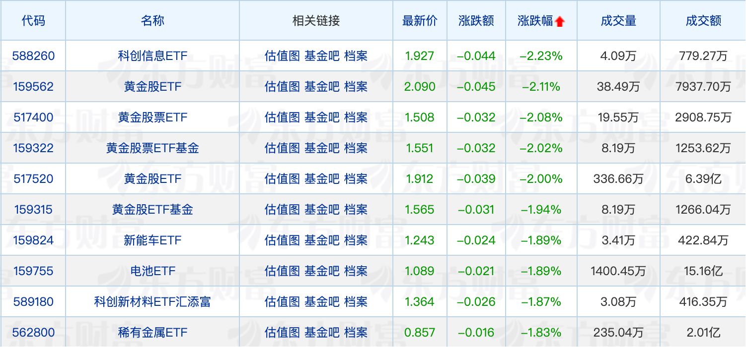 下跌方面,科创信息ETF领跌2.23%,黄金股相关ETF悉数回调。