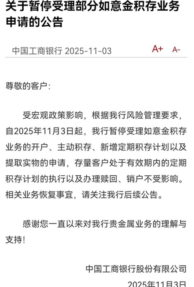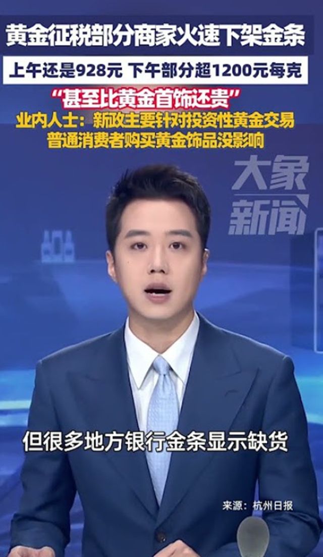 2025年11月1日,财政部和税务总局联合发布的《关于黄金有关税收政策的公告》正式实施,像一颗炸弹投向了平静的黄金市场。 黄金出库才征税,不出库不征税,但一旦实物黄金从上海黄金交易所或上海期货交易所的金库提出来,就要根据用途交税。 周大福的投资金条从948元/克飙升至1132元/克,菜百首饰直接下架金条,替换的新品价格暴涨近200元/克。 工商银行、建设银行同日宣布暂停黄金积存业务的实物提取功能。 这意味着,很多通过银行定投黄金的客户,突然发现自己的“纸黄金”无法换成实体金条了。 有网友爆料,在银行柜台,工作人员甚至以系统升级为由拒绝已预约的提金申请。 实物黄金投资瞬间陷入“买不到、取不出”的僵局。