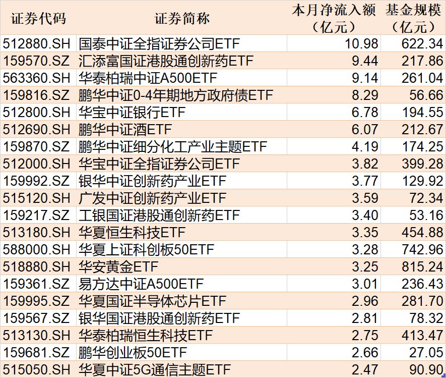 与此同时,华夏上证50ETF基金份额减少3.80亿份,净流出额为11.95亿元;华泰柏瑞沪深300ETF基金份额减少1.39亿份,净流出额为6.56亿元;南方中证500ETF基金份额减少0.71亿份,净流出额为5.23亿元。 截至11月3日,本月资金净流入额居前20的ETF名单如下: