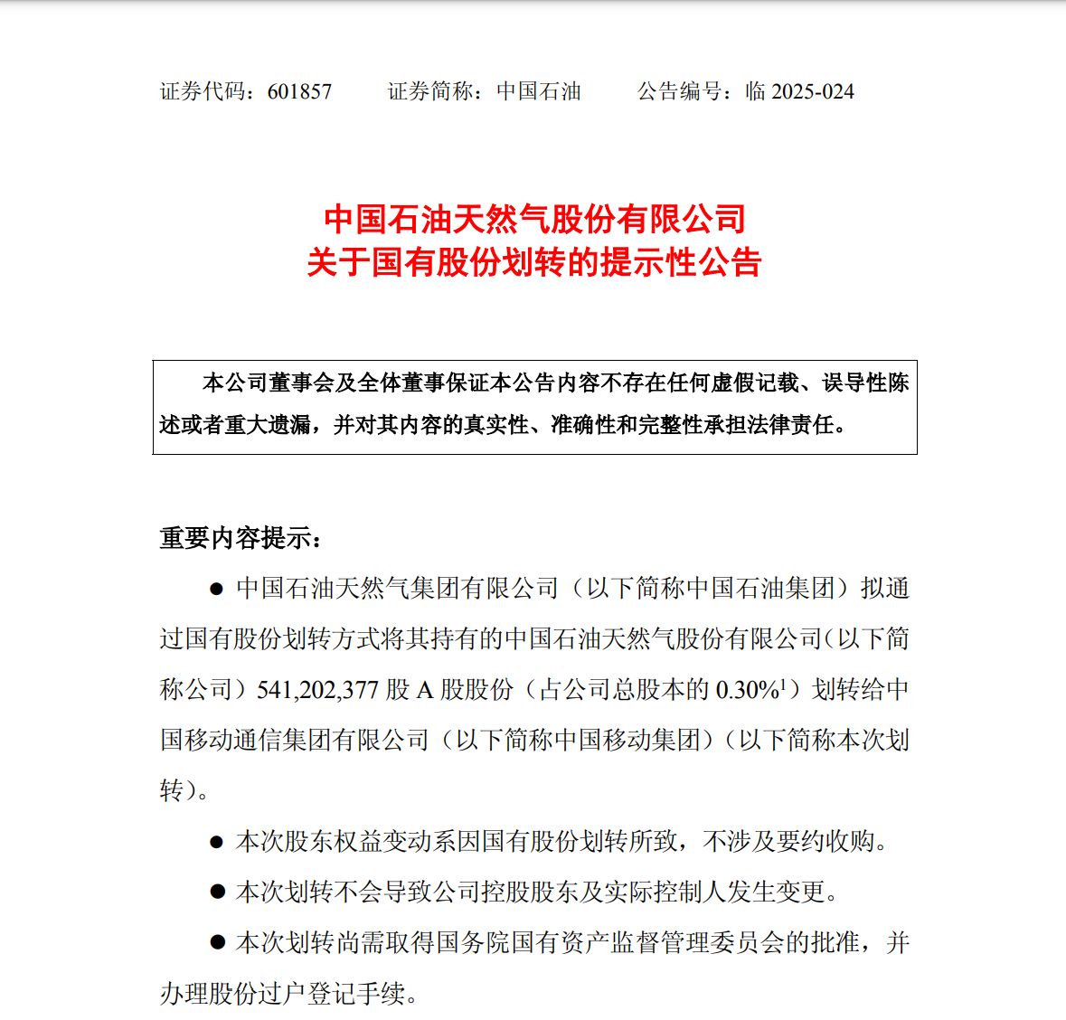 此次划转前,中国移动集团合计持有中国移动149.32亿股股份,约占公司已发行股份总数的69.05%,其中直接持有公司4236.70万股A股股份,通过中国移动香港(BVI)有限公司间接持有148.90亿股香港普通股股份。 中国石油集团此前未持有中国移动股份。本次划转后,中国移动集团合计持股约占公司已发行股份总数的68.85%;中国石油集团将直接持有中国移动约0.19%的股份。 中国移动公告显示,此次划转是为了进一步加强中国移动集团与中国石油集团的战略协同,促进双方在信息技术、智慧能源等领域共谋合作发展,释放数实融合新潜能。 此前,中国石油(SH601857)于9月2日公告,中国石油集团拟通过国有股份划转方式,将其持有的中国石油5.41亿股A股股份(占公司总股本的0.30%)划转给中国移动集团。 中国石油表示,此次划转是为了进一步深化中国石油集团与中国移动集团的战略合作,拓宽合作领域,优化公司股权结构,实现优势互补、合作双赢、共同发展。