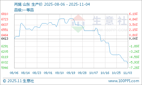 成交层面:“刚需采买”特征明显。下游工厂和贸易商普遍持谨慎态度,入市采购以满足短期生产需求为主,大单、囤货行为稀少。市场成交气氛不温不火,“一单一谈”现象普遍。 1.需求端: 主力下游表现平平: 丙烯酸酯(丙烯酸丁酯等):其下游的胶粘带、涂料等行业处于传统淡季,订单增量有限,对原料的消耗速度平稳,难以形成集中采购潮。 SAP(高吸水性树脂):主要用于卫生用品领域,需求相对稳定,但缺乏超预期的增长点。 高分子乳液:建筑和纺织领域需求一般。 买涨不买跌心态:由于对后市预期偏谨慎,终端用户普遍没有强烈的备货意愿。价格持稳甚至略有松动时,他们更倾向于“按需采购”,等待更低的价格或更明确的市场信号。 2.供应端: 开工率维持中高位:11月以来,丙烯酸行业整体开工率保持在65% - 70%左右。虽然部分装置有例行检修,但并未对市场供应造成显著冲击,货源供应充足。 库存压力可控:生产工厂的库存水平整体处于中位,并未出现严重的库存积压。这使得工厂在价格博弈中具有一定底气,不愿大幅降价销售,从而对价格形成底部支撑。 3.成本端: 原料丙烯价格走弱:11月后,主要原料丙烯的价格出现了一定程度的回落。截止11月4日,生意社丙烯基准价为6018.25元/吨,与本月初(6058.25元/吨)相比,下降了0.66%。这削弱了丙烯酸的成本支撑,也为丙烯酸价格的阴跌提供了空间。成本的松动,使得丙烯酸工厂的利润压力有所缓解,但同时也降低了市场对高价丙烯酸的接受度。