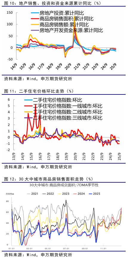 1-9月份房地产开发投资同比下降13.9%,商品房销售额累计下降7.9%,房地产开发资金来源累计同比下降8.4%,降幅继续扩大。 9月份,一线城市二手住宅销售价格环比下跌1%,连续6个月环比下滑。二三线城市二手住宅销售价格环比继续下降,降幅有所扩大。 从30大中城市高频数据看,日销售面积处于低位。总体房地产投资、销售、价格仍未企稳,仍处于调整中。 关注一线城市房价变化和专项债允许用于土地储备、支持收购存量商品房用作保障性住房进展情况。