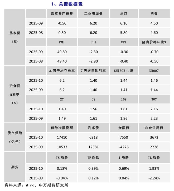 摘要 10月份以来,国债期货价格走势偏强,一改三季度的弱势走势,主要是央行加大公开市场操作力度,恢复国债买卖操作,市场资金面转松,加上海外美国政府停摆,美联储降息和中美贸易摩擦等因素影响。 展望后市,尽管中美经贸磋商达成共识,但外部环境复杂严峻,不确定性仍存在,美联储进入降息周期后,美债收益率总体回落,国内货币政策空间加大。国内工业生产保持高位,以房地产为代表的需求端仍疲软,物价处于低位,二十届四中全会提出了“十五五”时期经济社会发展的主要目标,预计央行降准降息仍有空间,且将加大国债买卖等操作,资金面保持合理充裕,为“十五五”经济稳定增长和金融市场稳定运行营造适宜的货币金融环境,对国债期货价格也具有一定的支撑,关注跨期套利等策略机会。