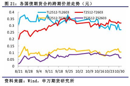 二、11月份行情总结展望 1、政策助力期债价格回升 10月份以来,国债期货价格走势偏强,一改三季度的弱势走势,主要是央行加大公开市场操作力度,恢复国债买卖操作,市场资金面转松,加上海外美国政府停摆,美联储降息和中美贸易摩擦等因素影响。 展望后市,尽管中美经贸磋商达成共识,但外部环境复杂严峻,不确定性仍存在,美联储进入降息周期后,美债收益率总体回落,国内货币政策空间加大。国内工业生产保持高位,以房地产为代表的需求端仍疲软,物价处于低位,二十届四中全会提出了“十五五”时期经济社会发展的主要目标,预计央行降准降息仍有空间,且将加大国债买卖等操作,资金面保持合理充裕,为“十五五”经济稳定增长和金融市场稳定运行营造适宜的货币金融环境,对国债期货价格也具有一定的支撑。 2、期现套利机会不明显 近期,国债期货价格和各主力合约对应的IRR有所回升,期货价格强于现货价格,但总体保持在1.8%附近,期现套利机会不明显。 3、关注跨期价差变化 国债期货的交割月份一般是 3、6、9、12四个季月。国债期货的跨期价差就是指的主力合约与它下一个季月的国债期货合约价格之差。11月份,2512合约将逐步开始移仓至2603合约,关注11月份移仓期间的跨期价差变化情况。 4、关注跨品种利差走势 10月份,长端利率下行幅度大于长端,长短端利差有所扩大,关注跨品种利差走势。