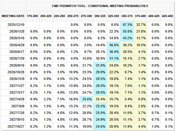 美联储主席鲍威尔在上周利率决议公布后表示,12月降息“绝非板上钉钉”。随后,多位地区联储主席对过度降息表露谨慎立场。堪萨斯城联储主席施密德发表声明,反对在上周会议上降息25个基点。达拉斯联储主席洛根发表讲话称,更倾向于在上周维持利率不变,并认为12月再次降息难度较大。克利夫兰联储主席哈马克则认为,当前的利率水平并不远离其所给中性利率的预测,这表明他认为降息空间已经非常有限。 芝加哥联储主席古尔斯比也在本周一释放了鹰派信号。他表示自己尚未决定是否支持12月降息,并称当前他对降息的门槛“比前两次会议更高”。古尔斯比表示,通胀已经连续四年半高于目标,并且“走势仍不理想”,这让他对继续放松政策保持谨慎。他承认就业市场有所降温,但仍认为大多数指标显示劳动力需求尚属稳定。他特别警告,在政府停摆、数据不完整、通胀趋势不明的背景下,贸然提前降息可能犯下“抢跑式政策错误”,并强调“利率应该随着通胀一起下行,而不是提前下行”。 不过,也有部分美联储官员支持进一步降息。旧金山联储主席戴利周一表示,她支持美联储上周实施的25个基点降息,并认为在通胀仍高于2%目标、但劳动力市场正在降温的情况下,“适当再稍微降低一下政策利率”。美联储理事库克也表示,12月会议依然是“有可能降息的会议”,并指出当前通胀风险和就业风险“双向上升”。在她看来,若利率维持过高,劳动力市场可能出现更急剧恶化。 数据显示,市场目前预计,美联储12月降息概率在67%左右。但随着经济数据缺失、通胀趋势不明、就业降温速度存在分歧,政策前景正变得更加不确定。