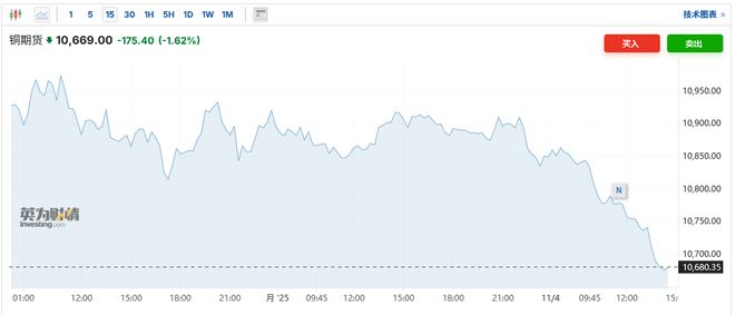 智通财经APP获悉,由于美联储12月降息前景存在不确定性,贱金属价格承压。其中,铜价从上周的创纪录高位进一步回落,伦敦金属交易所(LME)六大主要铜期货全线下跌。截至发稿,LME三个月期铜合约跌1.62%,报10669.00美元/吨。