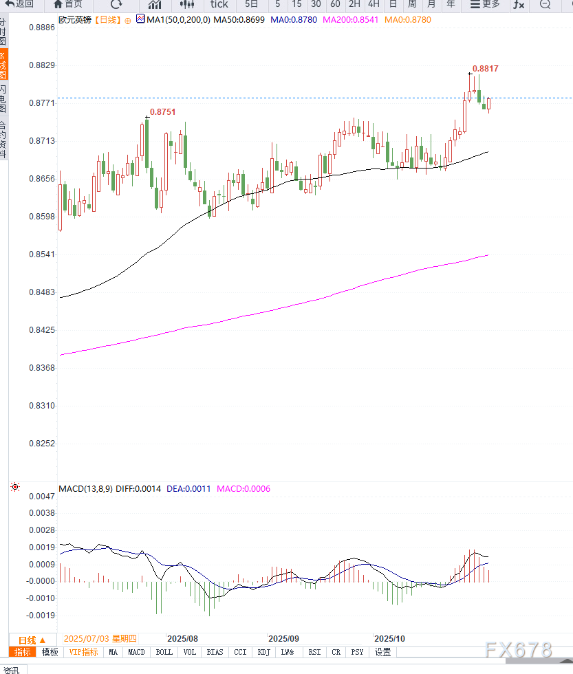 欧元兑英镑(EUR/GBP)周二早盘小幅上扬至0.8775,终结此前连续两日跌势。英镑走软成为本轮反弹的关键推动力,市场普遍聚焦本周四即将公布的英国央行(BoE)利率决议。 ![]() 欧元方面,欧洲央行(ECB)上周连续第三次维持存款利率在2.0%不变。欧洲央行行长拉加德(Christine Lagarde)在会后表示,央行目前处于“良好位置”,并将采取一切必要措施维持这一有利状态。 与此同时,欧洲央行管委会成员纳格尔(Joachim Nagel)也指出,欧元区经济数据表现与央行预期一致,但政策选择仍保持灵活性。 除了货币政策因素外,法国国内政治不确定性也为欧元走势带来额外压力。法国总理塞巴斯蒂安·勒科尔努(Sebastien Lecornu)的政府在下议院未能通过富人税法案后,面临更大的政治压力。 市场担忧,这可能重演前任政府因财政方案遭到否决而被迫辞职的局面,甚至导致提前选举。若法国政治局势再度恶化,可能短线削弱欧元兑英镑的反弹动能。 技术面上,欧元兑英镑在0.8750附近形成阶段性支撑,短线突破0.8770后,上方初步阻力位位于0.8800及0.8825区域。若英国央行周四释放鸽派信号,汇价或进一步上探0.8850关口; 反之,若央行态度偏向维持高利率周期,英镑或重新走强,令该货币对回调至0.8740附近。 ![]() 从市场结构来看,欧元兑英镑的短期波动核心在于英国央行政策预期的变化。若英国央行释放宽松信号,将为欧元提供短线支撑;但法国政治不确定性则可能成为限制欧元涨势的潜在风险。 总体而言,在英国经济数据走弱与欧元区政策稳定的背景下,EUR/GBP或维持温和上行,但后续趋势仍取决于英国央行对通胀前景的最新表态。 |
