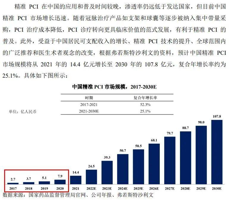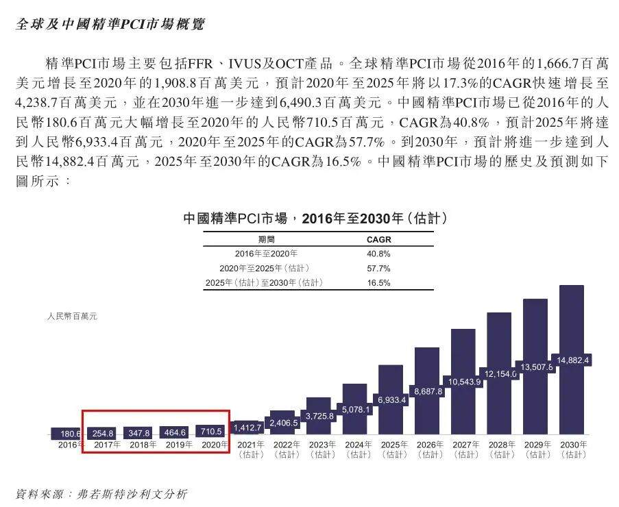 (截图来自科创板IPO第一版招股书申报稿) 针对国内精准PCI市场规模的数据统计上,港股招股书披露,2017年至2020年,各期的市场规模分别为为2.55亿元、3.48亿元、4.65亿元、7.11亿元。科创板IPO的第一版招股书申报稿显示,2017年至2020年,中国精准PCI市场规模分别为2.70亿元、3.70亿元、5.10亿元、7.90亿元。