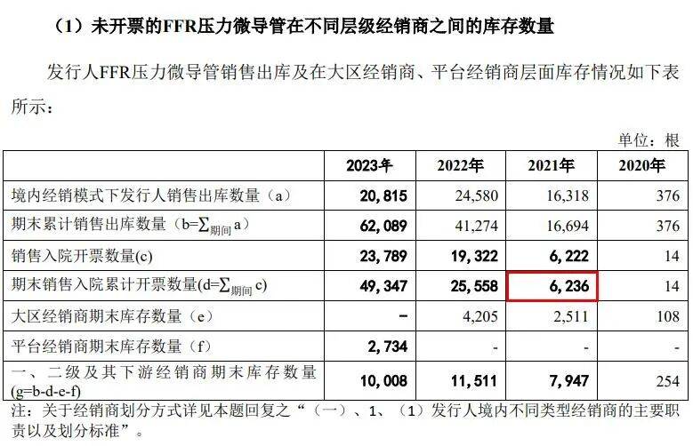 (截图来自科创板IPO第一版招股书申报稿) 上述数据的收集均提到了第三方市场调研机构弗若斯特沙利文,根据其官网介绍,弗若斯特沙利文是一家全球增长咨询公司,1961年成立于华尔街,1998年进入中国。公司利用数据库和专家库、运用专业知识和咨询工具,帮助客户加速成长步伐,助力客户在行业内取得增长、科创、领先的标杆地位,实现融资及上市等资本运作目标。近10年来,弗若斯特沙利文蝉联中国企业赴香港及境外上市行业研究顾问市场份额领导地位;且近年来,弗若斯特沙利文报告也被广泛引用于业内A股、科创板等上市公司的招股文件、一级和二级市场研究报告及其他资本市场公示文件中。 去年小杨哥带货美诚月饼翻车的事件闹得满城风雨,其中由弗若斯特沙利文颁发的“市场地位确认证书”就受到了广泛质疑。 核心产品销售价格异常,部分收入确认节点存疑 从此次IPO的申报材料来看,北芯生命针对FFR系统产品的信披存在多处疑点,其一是关于FFR主机的销售价格问题。 根据第一版招股书申报稿,2020年北芯生命的主营业务收入为158.76万元,其中FFR主机的收入金额为18.90万元,当期销售数量为14台。根据第一版首轮问询回复,2020年,北芯生命向大区经销商江苏大群医疗器械有限公司销售FFR主机10台,单价为1.86万元/台,合计金额为18.58万元。由此来看,那剩余4台FFR主机的合计销售金额仅为0.32万元。 但是从报告期内FFR主机销售情况来看,北芯生命销售给上海依舟贸易有限公司、广东海王医药集团有限公司等多个大区经销商的单价是没有差异的,均为1.86万元/台。 根据北芯生命的销售策略,其为促进产品的学术推广及宣传,提供限量的设备免费供终端客户试用。当样机转销售时,样机由固定资产转入存货,并确认收入及结转成本。但2020年,北芯生命也不存在FFR主机试用转销售的情况。这4台FFR主机的销售为何出现销售价格异常?销售对象又是谁呢? 其二,北芯生命对部分客户销售产品的确认收入节点异于常规。 根据招股书,在境内经销模式下,北芯生命在经销商支付货款后安排发货,并于经销商签收时点确认收入。其中大区经销商隶属于境内销售模式。 据首轮问询回复,大区经销商安顺利和(北京)医疗科技有限公司(下称“安顺利和”)成立于2020年6月,在公司成立当年,北芯生命未向其销售FFR压力微导管。但安顺利和2020年FFR压力微导管的进销存数据显示,入库数量为30根,出库20根,存货10根。 2021年,北芯生命向安顺利和销售FFR压力微导管2,143根。同期,安顺利和入库量为2,974根,比采购数量多出831根。也就说,安顺利和先收到货、确认入库,而北芯生命则在当年未对这831根FFR压力微导管确认收入。 再对照2022年和2023年1-6月,安顺利和确认的FFR压力微导管入库数量与北芯生命披露的销售数量则一一对应,分别为是731根、100根。 安顺利和的实控人是仲必文,仲必文曾于2021年10月前担任北芯生命的另一家大区经销商聚赢惠康(上海)科技服务有限公司(下称“聚赢惠康”)北京分公司的负责人。而且,2021年安顺利和还自聚赢惠康承接北芯生命华北大区的经销业务。但安顺利和与聚赢惠康不属于同一控制下的企业,且无关联关系。 从聚赢惠康的进销存数据来看,2020年,FFR压力微导管的入库数量和出库数量均为30根,北芯生命对其销售数量也为30根。2021年,聚赢惠康采购产品的入库数量和出库数量均为831根,北芯生命对其销售数量也为831根。 此外,北芯生命还存在一个明显的信披错误。 因更新年报财务数据,北芯生命公示了第二版首轮问询回复。该文件中,北芯生命将FFR压力微导管2021年和2022年的期末销售入院累计开票数量从原来的5,931根、23,914根调整为6,236根、25,558根。而第二版首轮问询回复的其他部分,2021年期末销售入院累计开票数量又出现第二个数据版本6,346根。