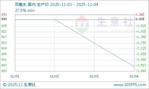 生意社11月04日讯 据生意社商品分析系统显示:11月初,双氧水行情下跌,价格走低。11月1日,双氧水市场均价930元/吨,11月4日,双氧水市场均价896元/吨,价格下跌3.58%。