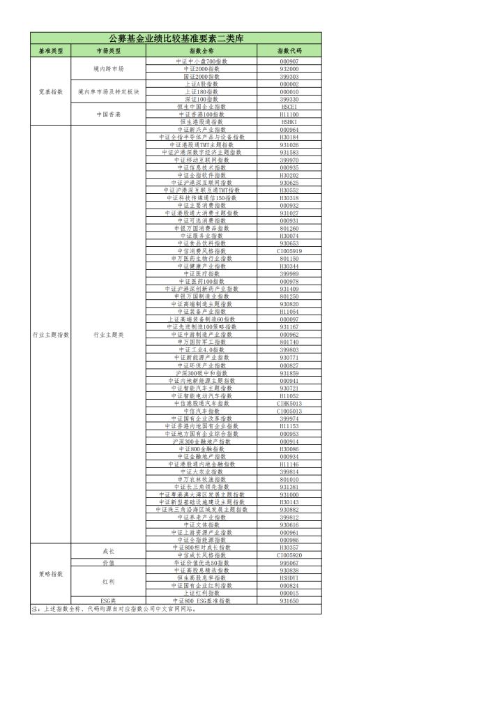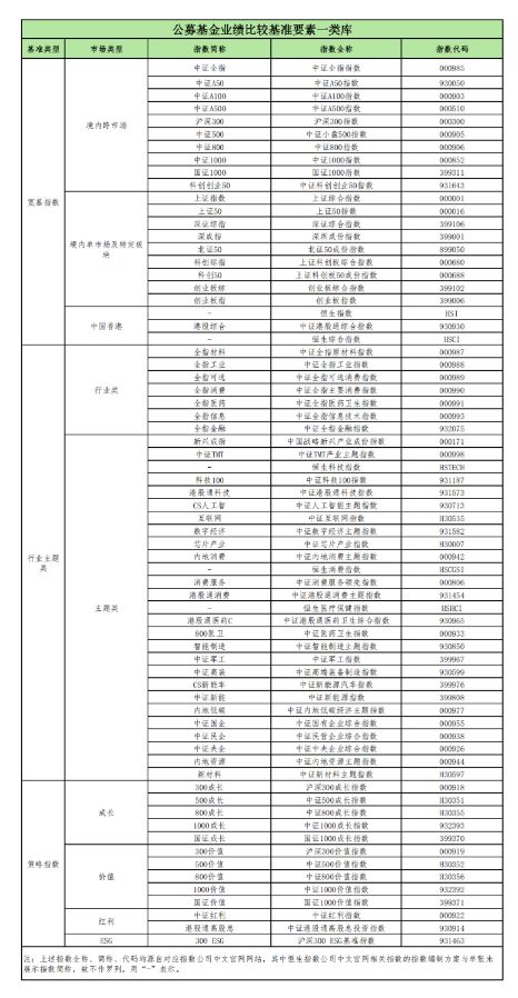 每经记者|李蕾 每经编辑|肖芮冬 《每日经济新闻》记者获悉,10月31日《公募基金业绩比较基准新规征求意见稿正式发布后,相关改革正在紧锣密鼓地落地,公募基金业绩比较基准要素库(以下简称基准库)名单和运作说明已经下发。 文件显示,为鼓励公募基金加大权益投资,明晰投资风格,基准库现阶段主要纳入股票指数,分为一类库和二类库,其中一类库有69只指数,二类库有72只,并将采取动态管理机制。 据悉,一类库纳入市场表征性强、认可度高的指数,鼓励基金管理人在开发主动管理型基金时规范选取和使用,提高产品间业绩的可比性;二类库兼顾创新和差异化,纳入具有一定使用频率、市值容量较大的指数,对一类库形成有效补充。根据相关要求,纳入基准库二类库的股票指数过去一年日均自由流通市值总值不低于5000亿元,一类库总值不低于10000亿元。 基金业绩比较基准改革加速落地,要素库名单下发10月31日,备受市场关注的公募基金业绩比较基准新规征求意见稿正式公布。证监会发布《公开募集证券投资基金业绩比较基准指引(征求意见稿)》(以下简称《指引》),基金业协会同步发布了《公开募集证券投资基金业绩比较基准操作细则(征求意见稿)》(以下简称《操作细则》),向社会公开征求意见。 记者从业内了解到,相关改革正在加速落地中,基准库名单和运作说明已下发给基金公司。 相关说明显示,为落实公募基金高质量发展行动方案要求,为公募基金管理人选择业绩比较基准提供参考,根据《指引》《操作细则》,在证监会指导下,中国证券投资基金业协会(以下简称协会)成立业绩比较基准专家工作组,在充分征求行业机构意见的基础上达成行业共识,建立、维护并公示基准库。 基准库的适用范围方面,主动管理型公募基金投资于境内A股市场、港股市场的资产,可以从基准库中选取基准要素。 分层和使用方面,为鼓励公募基金加大权益投资,明晰投资风格,基准库现阶段主要纳入股票指数,分为一类库和二类库。 其中,一类库纳入市场表征性强、认可度高的指数,鼓励基金管理人在开发主动管理型基金时规范选取和使用,提高产品间业绩的可比性;二类库兼顾创新和差异化,纳入具有一定使用频率、市值容量较大的指数,对一类库形成有效补充。 那么都有哪些指数入库?入库的标准又是什么呢? 一类库69只,二类库72只:应符合这些标准公募基金业绩比较基准要素库名单显示,一类库共有69只指数,二类库有72只(名单附在最后)。 那么入库的原则和标准是什么呢? 运作说明显示,基准库主要列示主指数,其他衍生指数(如不同币种、不同收益处理方式等)视同纳入。定制类指数暂不纳入业绩比较基准要素库。 纳入基准库二类库的股票指数应当符合以下标准: 1、单一标的指数成份证券权重不超过20%的宽基类指数; 2、满足以下条件的非宽基指数: (1)指数成份证券数量不低于30只; (2)单一成份证券权重不超过15%(或指数编制方案约定单个样本权重不超过15%)且前10大成份证券权重合计占比不超过80%; (3)指数发布时间不短于3个月; (4)过去一年日均自由流通市值总值不低于5000亿元; 3、截至入库数据统计时间,原则上至少被2家管理人的主动权益基金使用。为满足投资需求,表征特定投资方向的非宽基指数至少有1只。 而纳入一类库的股票指数原则上在符合二类库入库标准的基础上,要求指数成份证券过去一年日均自由流通市值总值不低于10000亿元。此外,综合考虑市场表征性、认可度、符合国家战略导向等其他相关标准。 例如,一类库中共有22只宽基指数,这类指数的入库至少满足以下任一条件:1、至少已被10只主动管理型基金用作业绩比较基准,且被近5年(即2020年以来)新成立的基金使用过。2、一类库中至少纳入1只上交所、深交所、北交所发布的单市场重要指数;3、符合投资导向,且经专家委员会评议通过的指数。 行业类指数则有7只,应满足为“中证全指行业优选指数”系列的一级行业指数,或属于国家重点发展的战略性新兴产业或国家政策大力扶持的重点领域等条件。 主题类指数的选取则以代表行业主流投资板块为主要原则,综合考虑国家发展导向和支持领域,基准库里共有27只。 此外还有13只策略类指数,这类指数入选的条件包括基于沪深300、中证500、中证800、中证1000、国证1000等重要宽基开发的成长及价值风格指数,或至少已被10只主动管理型基金用作业绩比较基准,表征性好的红利、ESG指数等。 采取动态管理机制,一、二类库之间可调整记者还注意到,基准库采取动态管理机制。 协会组织行业机构成立专家组,开展基准库建设和动态维护,对基准要素的纳入、移出和一、二类库之间的调整进行评估并决策。 例如,二类库中的基准要素,若满足一类库的入库标准,经专家组评议,可从二类库调入一类库。而一类库中的基准要素,不再满足一类库入库标准的,经专家组评议,也可从一类库调出。基准库外的基准要素,经专家组评议,可调入基准库,原则上首先调入二类库。 专家组由协会组建,由基金管理人、基金托管人、基金评价机构、基金销售机构等机构的专家代表组成,监管部门、自律组织可派员列席。建立动态监测机制,按季度启动基准要素的出、入库评估,每半年启动一、二类库之间的调整评估。 多位基金公司人士在接受《每日经济新闻》记者采访时表示,基准库