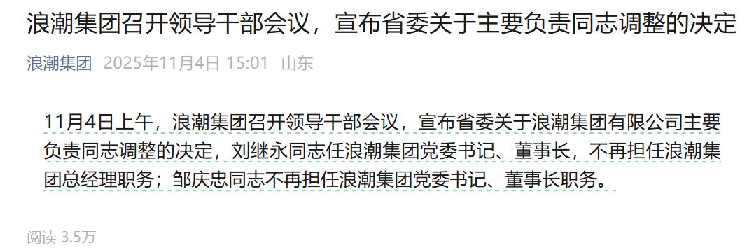 每经编辑|张锦河 据浪潮集团公众号,11月4日上午,浪潮集团召开领导干部会议,宣布省委关于浪潮集团有限公司主要负责同志调整的决定,刘继永同志任浪潮集团党委书记、董事长,不再担任浪潮集团总经理职务;邹庆忠同志不再担任浪潮集团党委书记、董事长职务。
