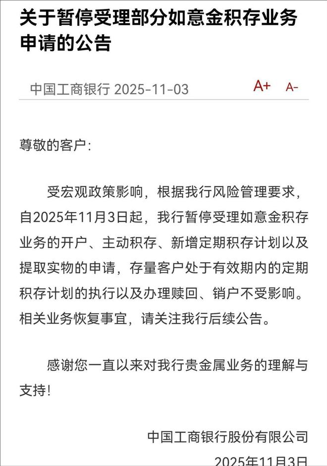 本文陈述内容皆有可靠信息来源,赘述在文章结尾。 4 工商银行、建设银行接连发布公告,宣布暂停黄金积存业务,消息一经披露,立即引发广泛关注。 5 与此同时,不少中小型贵金属商户紧急下架实体投资金条产品。部分金条报价一度突破1200元/克,为规避潜在税务风险,商家选择暂时退市观望。 6 在银行渠道中,一旦有实物金条重新上架,往往几分钟内就被抢购一空,最快的一次仅用4分钟便宣告售罄。