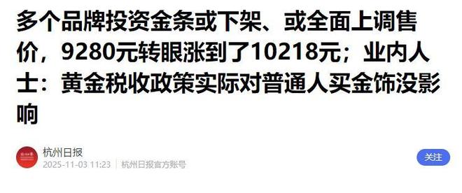 1 近期黄金市场风云突变,整个“黄金圈”仿佛被投入了一颗重磅炸弹。 2 11月1日,财政部与国家税务总局联合发布《关于黄金有关税收政策的公告》,一纸文件迅速点燃了市场的神经。 3 短短48小时内,行业反应之剧烈前所未有。
