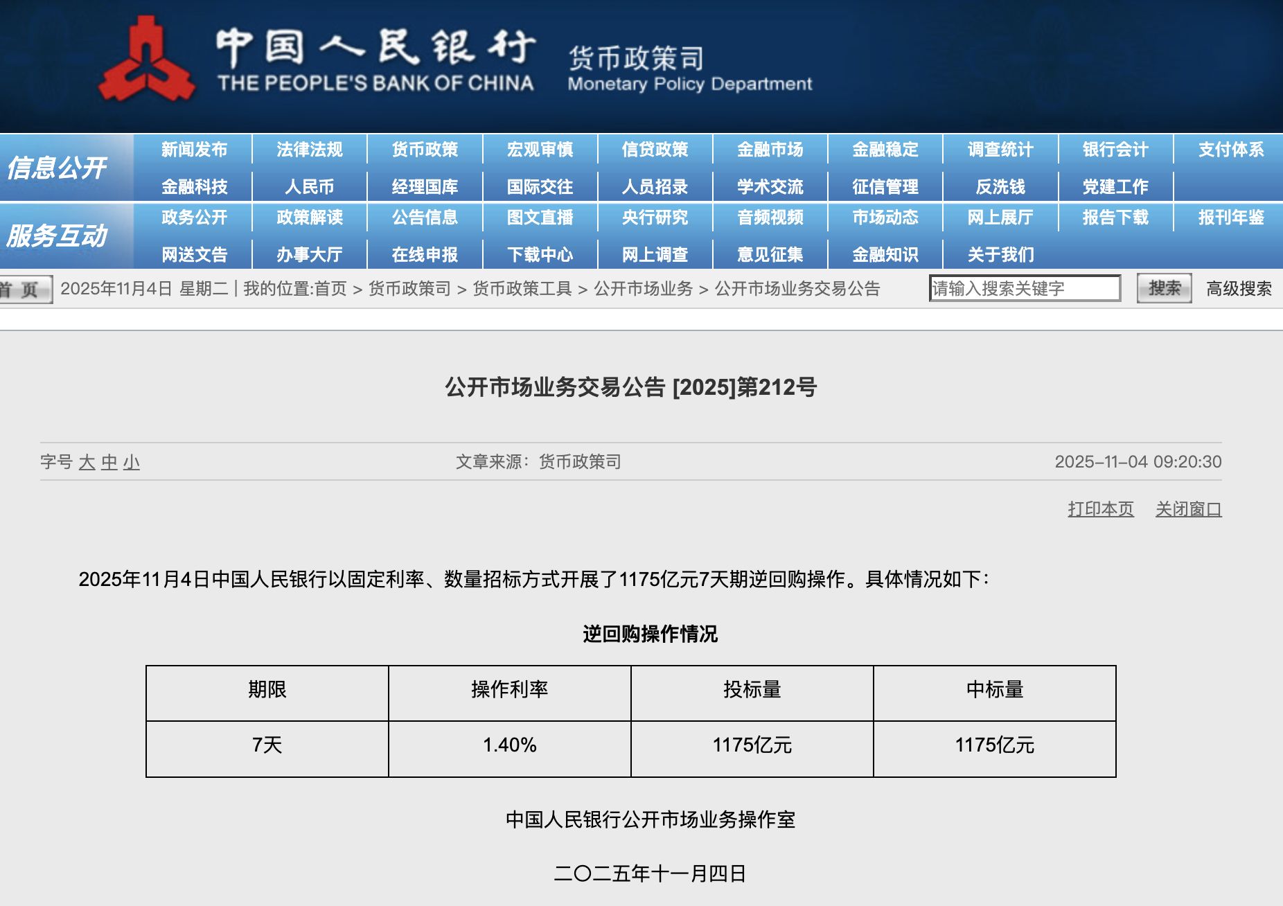每经编辑|黄胜 11月4日,央行公告,为保持银行体系流动性充裕,2025年11月5日,中国人民银行将以固定数量、利率招标、多重价位中标方式开展7000亿元买断式逆回购操作,期限为3个月(91天)。
