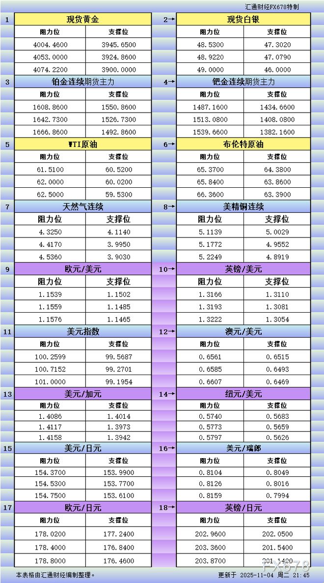汇通财经讯——11月4日美市美市更新的黄金、白银、铂金、钯金、原油、天然气、铜(商品)以及:美元指数、欧元、英镑、日元、瑞郎、澳元、加元、纽元(热门货币对)的支撑阻力位一览。 汇通财经APP讯——11月4日美市美市更新的黄金、白银、铂金、钯金、原油、天然气、铜(商品)以及:美元指数、欧元、英镑、日元、瑞郎、澳元、加元、纽元(热门货币对)的支撑阻力位一览。 【免责声明】本文仅代表作者本人观点,与汇通财经无关。汇通财经对文中陈述、观点判断保持中立,不对所包含内容的准确性、可靠性或完整性提供任何明示或暗示的保证,且不构成任何投资建议,请读者仅作参考,并自行承担全部风险与责任。 |