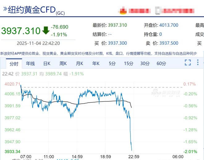 11月4日晚,现货黄金直线下跌,跌超1.5%,跌破3940美元/盎司。