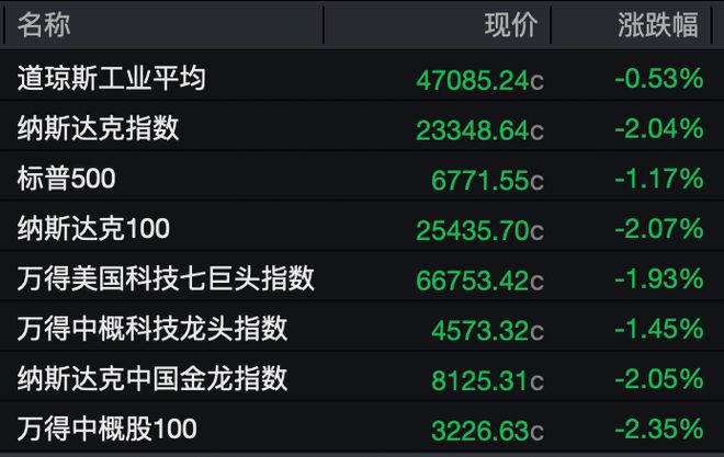 昨夜,美股三大指数集体收跌。纳指跌2.04%,标普500指数跌1.17%,道指跌0.53%。大型科技股普跌,英特尔跌超6%,特斯拉跌超5%,英伟达跌超3%,谷歌跌逾2%,亚马逊、Meta跌超1%,奈飞小幅下跌。