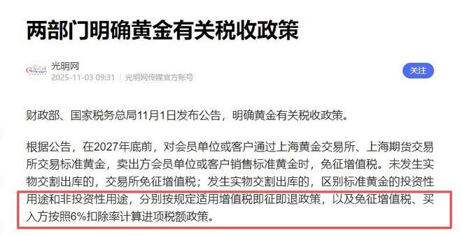 但这远不是一次简单的“加税”那么回事,政策的核心是通过财税手段,给疯狂的实物黄金投机行为降温。 它切断了投资类实物黄金增值税专用发票的抵扣链条,说白了就是让你再也不能用买金条的发票去抵扣别的税了。 这一招直接打在了那些想通过倒卖实物黄金赚快钱的投机者的七寸上,交易成本陡然增加。