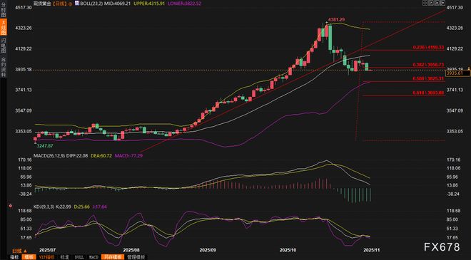 美联储12月降息预期降温,美元指数破百刷新三个月高点 一周前,芝商所FedWatch工具显示12月降息概率接近100%,如今已跌至70%;另有数据口径显示仅剩65%%。 降息预期的降温,给美元提供了强劲的反弹动能,进而压制金价走势。 周二美元指数一举冲破100关口,尾盘报100.21,为连续五个交易日上涨,盘中创下8月初以来的三个月新高100.22。这一波美元狂飙,直接推高了黄金对非美货币持有者的购买成本,令全球买盘望而却步。 高岭期货金属交易主管David Meger指出:“美元创下新高,黄金市场自然承压。更深层原因是12月降息概率骤降。” 股市泡沫警报拉响,资金集体逃向美债 AmeriVet Securities利率策略主管Greg Faranello指出:“AI股普跌,风险厌恶基调笼罩市场,美债成为优质避险港湾。”黄金本该在避险潮中分一杯羹,却因美元太强、利率预期太高,双双失色。 政府停摆35天,ADP报告成“孤注一掷”风向标 若10月ADP数据大幅不及预期(市场共识约+2.5万),将坐实劳动力市场降温信号,12月降息概率或瞬间回升至80%以上,金价有望借机反弹;反之,若数据超预期,美元将继续高歌猛进,黄金恐再探3900美元整数关口。 Pepperstone高级策略师Michael Brown直言:“这只是传统避险买盘,但美元仍是王者。” 此外,财政部周三还将公布季度再融资计划,巨额发债若推高长端收益率,黄金承压将雪上加霜。 结语:短期空头狂欢,长期仍看通胀与地缘 但放眼长期,全球央行购金势头不减、中东地缘风险暗流涌动、通胀粘性仍存,黄金作为终极避险资产的战略价值并未动摇。 投资者不妨在3900美元附近埋伏低吸机会,一旦避险情绪反转,多头反攻或一触即发。 此外,投资者还需关注美国10月ISM非制造业PMI数据,市场预期为50.8。另外,留意美国最高法院对特朗普“对等关税”合法性的审判。