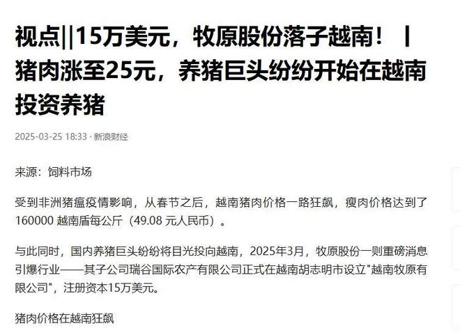 21 仟茂财经2025-03-25 视点‖15万美元,牧原股份落子越南!丨猪肉涨至25元,养猪巨头纷纷开始在越南投资养猪