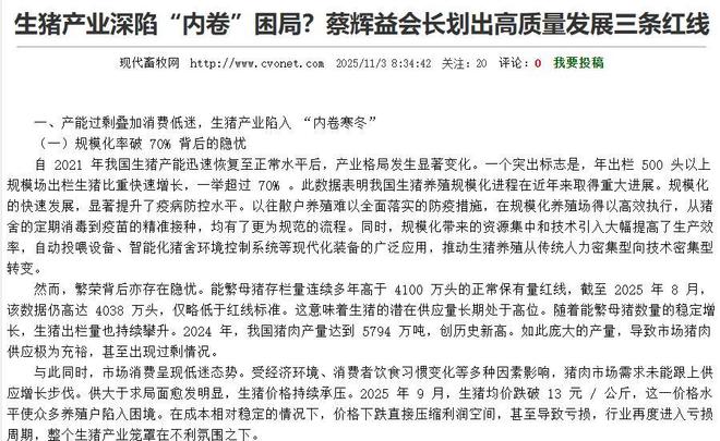 16 不过,海外市场并非无竞争的蓝海。随着多家巨头相继入局,区域竞争格局正迅速升温。牧原股份投入32亿元在越南建设智能化高楼养猪项目,输出全套数字养殖解决方案;海大集团境外营收在过去四年增长156.65%;扬翔集团牵头组建国际产业创新联盟,推广自主研发的智能养猪系统。 17 面对多方围剿,新希望能否凭借先发优势与全产业链协同效应继续保持领先地位,仍有待观察。 18 综上所述,新希望的三季度财报既是自身经营改善的结果,也是行业变革进程的一面镜子。随着能繁母猪存栏量逐步回归合理区间,产能压力有望缓释;而成本管控能力与技术创新水平,已成为决定企业生死存亡的根本要素;与此同时,拓展海外市场正成为打破增长瓶颈的战略要道。 19 对于新希望而言,未来关键在于如何强化饲料与养殖两大板块之间的资源联动效应,同时构筑更高壁垒的海外技术护城河,方能在新一轮行业洗牌中占据有利位置;而对于整个中国生猪产业来说,由“内卷式竞争”转向“全球性竞技”的转型浪潮,已然不可逆转。 20 信源来自:现代畜牧网2025-11-3 生猪产业深陷“内卷”困局?蔡辉益会长划出高质量发展三条红线