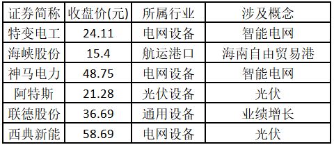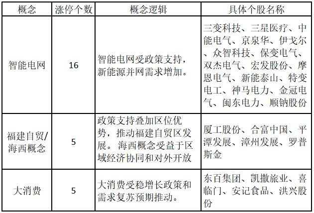 (注:行业涨停板个股越多,说明该行业被资金重点关注,是当前热门行业。) 从概念特征来看,今日涨停板个股中,智能电网、福建自贸/海西概念、大消费概念的个股最多。