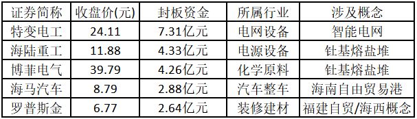 (注:主力资金净流入金额占市值比例越高的个股,说明该股被主力资金重点关注,值得重点关注。) 从封板资金来看,今日涨停板个股中,封板资金排名前5的个股包括特变电工、海陆重工、博菲电气、海马汽车、罗普斯金。