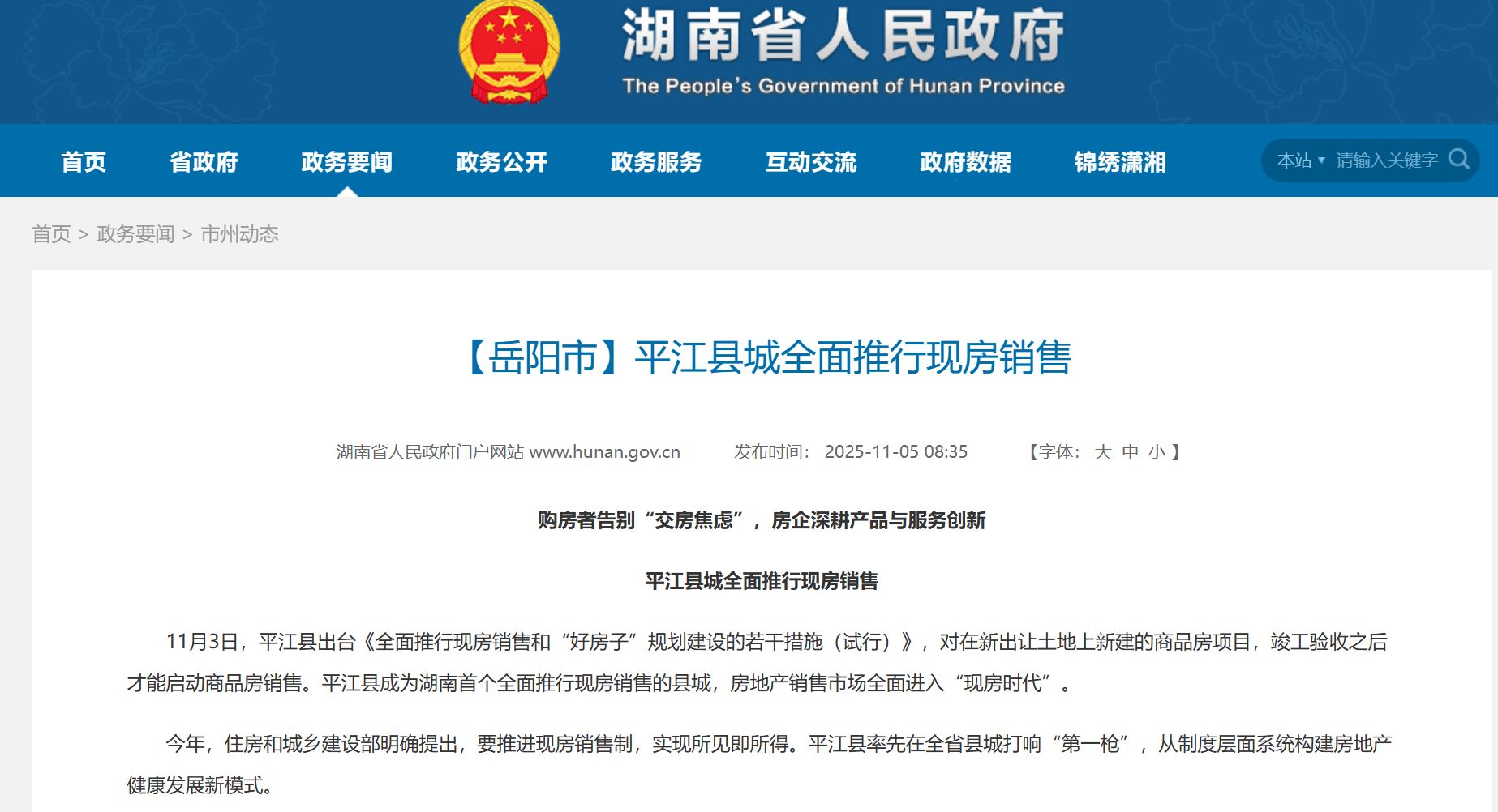 每经编辑|张锦河 据湖南省人民政府网站11月5日消息,11月3日,湖南岳阳平江县出台《全面推行现房销售和“好房子”规划建设的若干措施(试行)》,对在新出让土地上新建的商品房项目,竣工验收之后才能启动商品房销售。 平江县成为湖南首个全面推行现房销售的县城,房地产销售市场全面进入“现房时代”。“我们要用现房销售提振市场信心。”平江县住建局局长陈鑫介绍,现房销售政策出台前,他们广泛征求房企、市民代表意见,并对在建房地产项目实行专人负责、专班跟进,推行“拿地即开工”“联合验收靠前服务”改革,审批时限压缩40%。 今年1至10月,该县新建商品房网签销售1845套24.64万平方米,销售面积同比增长6.83%。