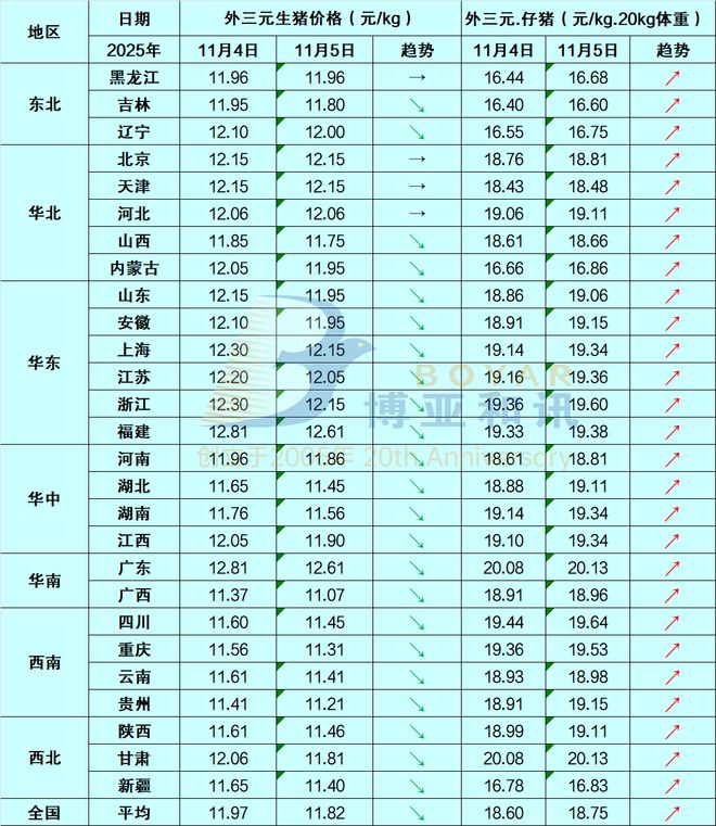 据博亚和讯监测,2025年11月5日全国外三元生猪均价为11.87元/kg,较昨日下跌0.15元/kg;仔猪均价为18.75元/kg,较昨日上涨0.15元/kg;白条肉均价15.95元/kg,较昨日下跌0.25元/kg;今日猪料比为3.54:1,较昨日减少0.04。 今日猪价稳中偏弱,全国均价下跌0.15元/公kg,跌幅较前两日有所收窄,其中华南、西南、西北部分地区价格跌至11.5元/kg以下。随着二次育肥热度减退,市场标猪供应增加,同时受标肥价差持续较大影响,大肥猪出栏意愿较强,整体生猪供应压力显著。十月下旬猪价上涨主要源于二次育肥集中入场造成的阶段性供应收紧,随着二次育肥积极性减弱,北方猪价回调幅度较大,南北价差拉大,推动部分北方猪源外调。随着猪价持续下跌,养殖端抗价心态增强,猪价再跌空间有限。今日市场情绪看稳、看涨、看跌并存,预计明日猪价震荡调整,北方低价区或有反弹,但幅度有限,关注养殖端出栏情况与终端白条实际走货情况。 会议聚焦