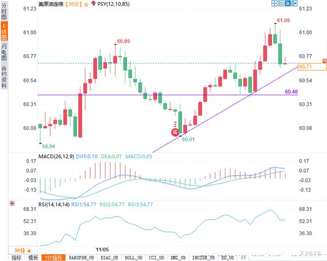 汇通财经讯——周三(11月5日),美原油(WTI主力)欧洲时段围绕60.70美元交投;早些时候价格一度靠近60.00附近随后回升。盘面呈现“数据偏空—地缘偏多—技术修复”的交织格局,短期主导因子转向当晚的EIA商业原油库存。 汇通财经APP讯——周三(11月5日),美原油(WTI主力)欧洲时段围绕60.70美元交投;早些时候价格一度靠近60.00附近随后回升。盘面呈现“数据偏空—地缘偏多—技术修复”的交织格局,短期主导因子转向当晚的EIA商业原油库存。