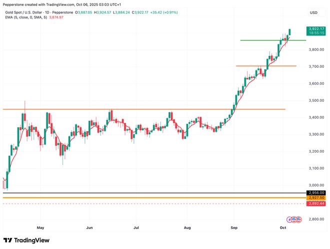 黄金回调压力不减,避险需求降温、中国税改及美联储鹰派立场打压金价。短期震荡偏空,Pepperstone 研究策略师 Dilin Wu 提醒您关注美国就业与服务业 PMI数据。 过去一周,黄金价格震荡走弱。中美关系的阶段性缓和、中国取消黄金增值税抵扣的政策调整,以及美联储内部在利率前景上的分歧加大,共同压制了黄金的短线上行动能。进入本周,Pepperstone 研究策略师 Dilin Wu建议您将焦点将转向美国ISM服务业PMI及多项“非官方”劳动力数据的公布,这些数据或为金价走势带来新的波动契机。 技术面观察: 短线压力明显,关注$4,000 反应 从XAUUSD日线图来看,黄金上周整体延续回调,周二一度下探 $3,886,创下自10月6日以来新低。 尽管技术性买盘和长期配置需求推动金价在周四于$3,900附近企稳反弹,当日收涨2.4%,并重新站上$4,000 关口,但仍未摆脱周线收跌的局面,表明短线调整压力依旧存在。 然而,从更长周期来看,金价上行趋势仍具韧性,10月已实现连续第三个月上涨,累计涨幅达3.7%。