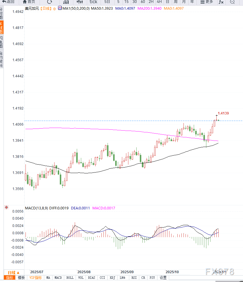 周四欧盘时段,USD/CAD 自近期高位回落至 1.4100 以下,结束此前连续五天上涨表现。 ![]() 美国方面,最新就业数据对美元形成支撑。ADP 报告显示,美国10月私营部门就业增加42,000人,不仅好于市场预期25,000人,也显著扭转前值下降态势。 尽管就业数据向好,美联储主席鲍威尔强调,12 月是否降息尚不确定。CME FedWatch 显示,市场对12月降息可能性的押注已从93%降至 约70%。 油价反弹叠加美联储降息预期降温,使美元失去部分动能,为加元反弹提供空间。 从日线结构来看,USD/CAD 在1.4160–1.4200 区域形成双重压力区,该区域对应布林带上轨与阶段性高点重叠,价格在5连涨后出现明显动能衰竭,RSI 指标从超买区回落。 短期支撑位位于 1.4040–1.4000 区间,若跌破,则将打开进一步回调空间至 1.3920(20日均线附近)。整体趋势仍保持上升结构未破坏,但当前处于上涨后的技术性修正阶段。 ?? ![]() 当前阶段,USD/CAD 的走势更像是多头获利回吐后的短线回调,而非趋势反转。影响方向的关键变量仍是油价与政策预期差,等待调整结束。 |