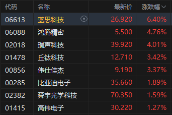苹果概念走高,蓝思科技涨超6%。蓝思科技董事长周群飞今日表示,蓝思科技在具身智能硬件制造领域已实现规模化交付,2025年人形机器人预计出货3000台、四足机器狗10000台以上,整机组装规模稳居行业第一梯队,已成为全球最大的具身智能硬件制造平台之一。