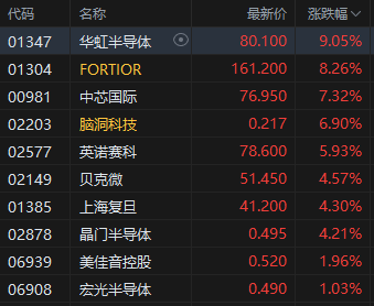 半导体板块午后走强,华虹半导体涨超9%。今年前三季度半导体行业上市公司净利润再创新高,可比口径下同比增长53%,增速再度反超营业收入,盈利能力和运营效率普遍提升,其中,封装测试、模拟芯片等板块净利润增长领先,人工智能拉动数据中心等环节爆发,光通信、功率器件等环节显著贡献利润,整体上市公司产品结构向高端化升级。