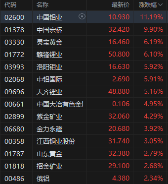 有色金属板块强势,中国铝业涨超11%。花旗发布研报称,铝业仍然是花旗最看好的行业之一,因为该行预计铝供应将保持紧张,这得益于中国的产能上限政策(年产能4520万吨)以及印尼不会出现爆发性的产能增加,从而导致铝业毛利长期维持高位。