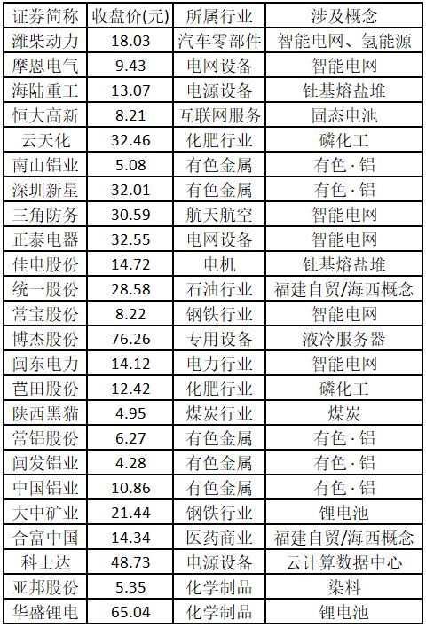 (注:创出历史新高的涨停股,说明该股人气旺盛、趋势明确,且上方无阻力,延续原上涨趋势概率较大。) 涨停板个股中,股价创出近一年新高的个股有24只(不包括创出历史新高的个股),包括潍柴动力、摩恩电气、海陆重工、恒大高新、云天化、南山铝业、深圳新星、三角防务、正泰电器、佳电股份、统一股份、常宝股份、博杰股份、闽东电力、芭田股份、陕西黑猫、常铝股份、闽发铝业、中国铝业、大中矿业、合富中国、科士达、亚邦股份、华盛锂电,具体如下表所示。