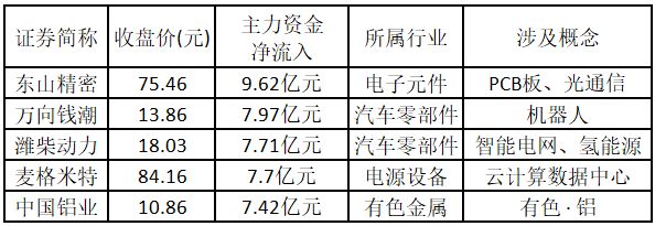 (注:创出近一年新高的涨停股,说明该股走出重要突破行情,值得重点关注。) 从主力资金来看,今日涨停板个股中,主力资金净流入金额排名前5的个股分别为东山精密、万向钱潮、潍柴动力、麦格米特、中国铝业。