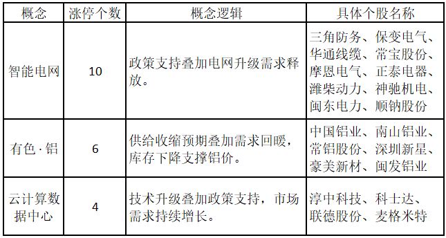 (注:行业涨停板个股越多,说明该行业被资金重点关注,是当前热门行业。) 从概念特征来看,今日涨停板个股中,智能电网、有色·铝、云计算数据中心这三个概念的个股最多。