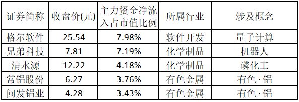 (注:主力资金净流入金额越多的涨停股,说明该股被主力资金重点关注,值得重点关注。) 主力资金净流入金额占市值比例排名前5的个股分别为格尔软件、兄弟科技、清水源、常铝股份、闽发铝业。