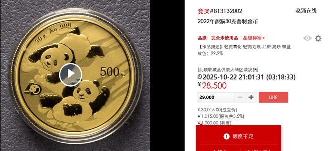 10月22日的黄金市场风云涌动,早盘一度跌到4004.46美元/盎司的低位,虽说后来有所反弹,但单日震荡幅度超100美元,把不少纯黄金投资者惊出一身冷汗。 更值得关注的是,同日多款料价币的竞拍结果,和咱们平时买的金饰比起来,投资优势一下子就凸显出来了。先给大家报组最新价:今天国内实时金价是941元/克,而周大福、六福等品牌金饰克价还在1235元,老凤祥也有1229元,金饰比原料价足足高了近300元/克。反观几款料价币的竞拍价,几乎是贴着黄金原料价走,这样的性价比可不是金饰能比的。 来看看具体的例子。2022年熊猫30克普制金币,今天竞拍最终以28500元成交。按照941元/克的实时金价计算,这枚金币的黄金原料价值是30×941=28230元,竞拍价仅比原料价高出270元,溢价还不到1%。如果换成购买同等克重的品牌金饰,按1235元/克计算,需要支付30×1235=37050元,比这枚金币足足贵了8550元! 熊猫金币大家都熟悉,是国家法定货币,纯度有保障,而且普制币流通性好,想出手的时候很方便。对咱们中年朋友来说,这种“几乎不花溢价”就能拿到的黄金藏品,既保住了黄金的避险属性,又多了层藏品的增值空间,比买溢价虚高的金饰划算太多。