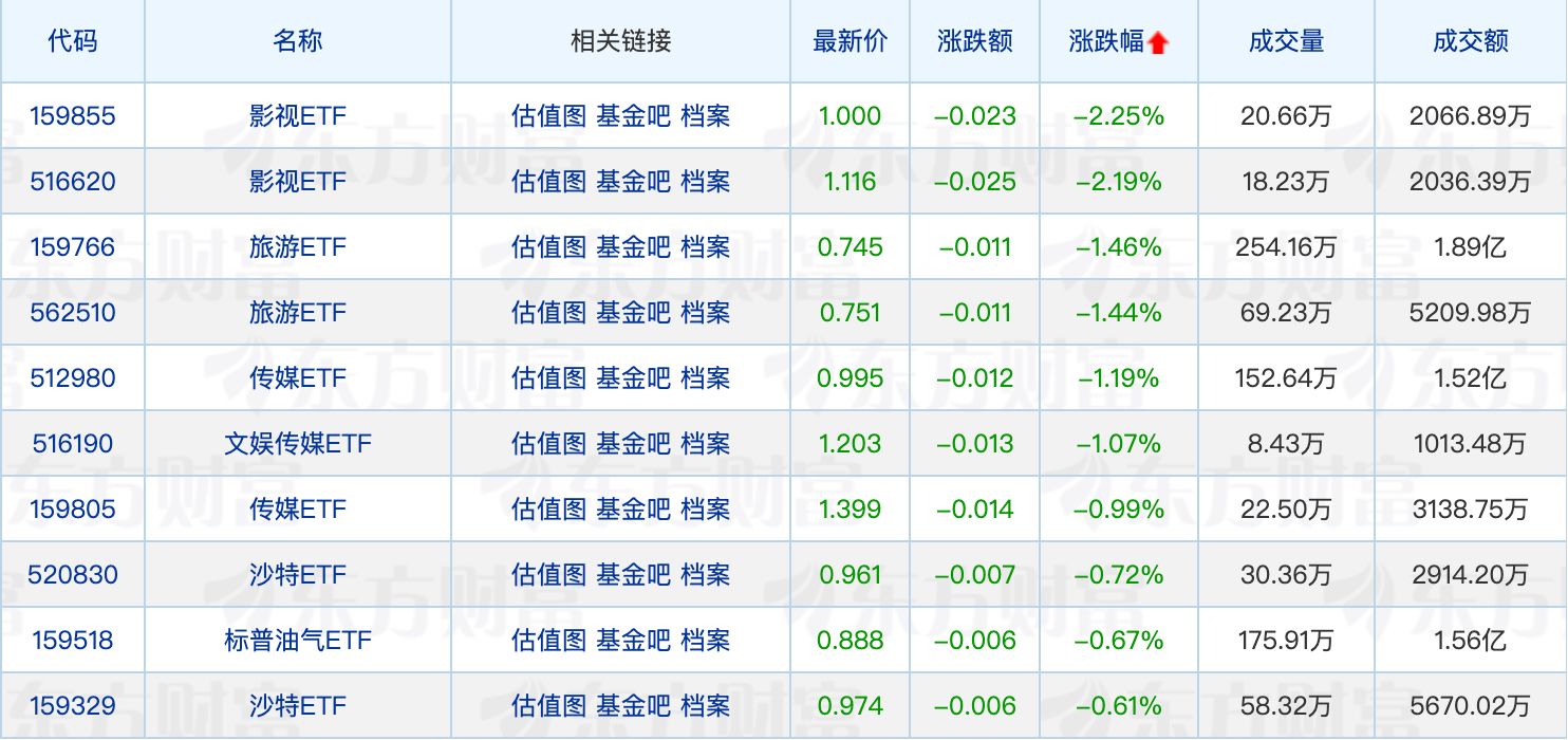 下跌方面,影视ETF领跌2.25%,游戏、文化传媒相关ETF回调居前。