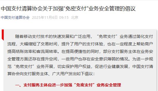 每经编辑|杜宇 一份关乎支付行业规范发展的重要倡议发布。 据中国支付清算协会官方微信号,11月6日,针对公众关注的免密支付安全问题,中国支付清算协会重磅发声,从支付服务主体和用户两个角度提出倡议,进一步规范“免密支付”业务开展,为“免密支付”加上“安全锁”。